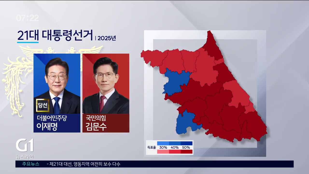 과반에 가까운 전국 득표율을 얻은 이재명 대통령이지만 강원도에선 고전한 셈 입니다.