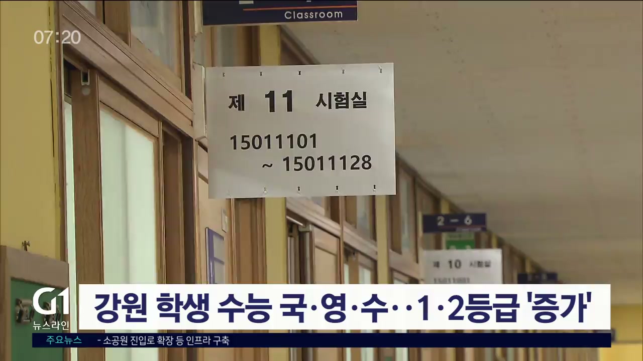 강원자치도교육청에 따르면 수능 상위 등급인 1·2등급 비율은 2024학년도 수능 대비 국어는 0.4%p, 수학은 0.7%p, 영어는 0.4%p 늘었습니다.