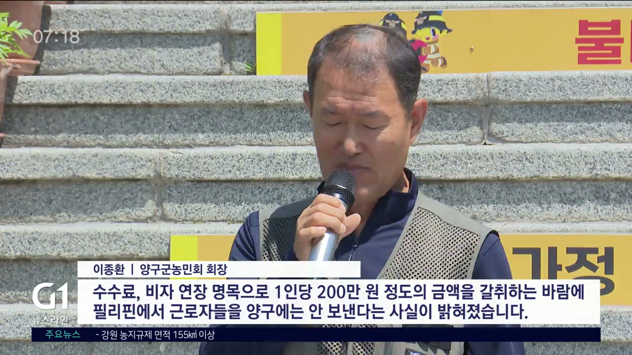 "수수료, 비자 연장 명목으로 1인당 200만 원 정도의 금액을 갈취하는 바람에 필리핀에서 근로자들을 양구에는 안 보낸다는 사실이 밝혀졌습니다."