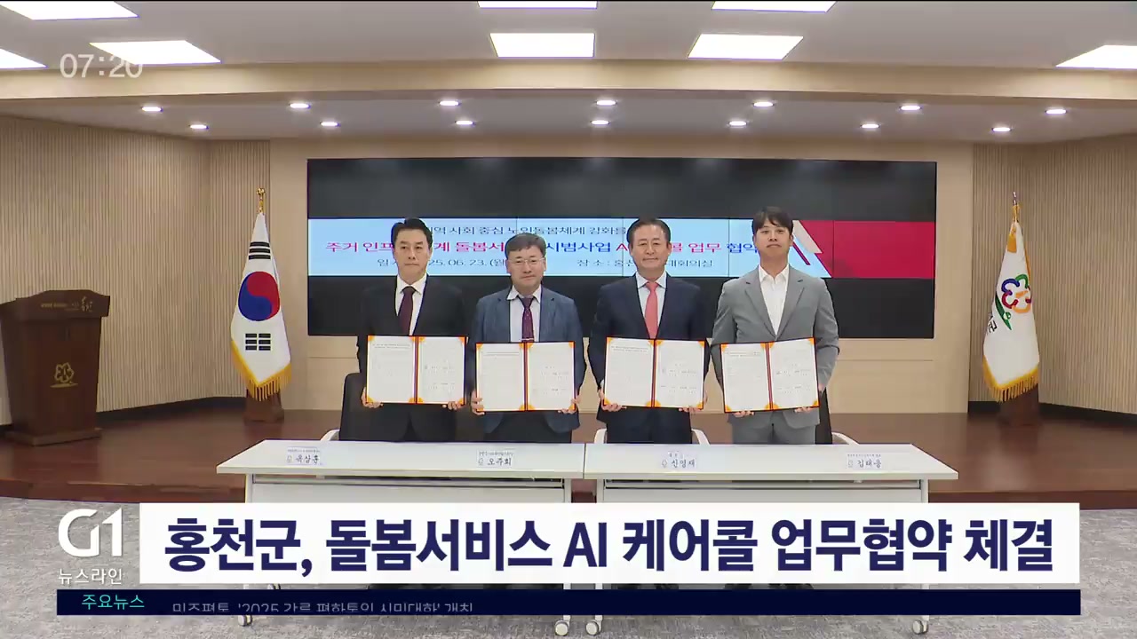 홍천군은 어제(23일) 홍천군청 대회의실에서 사업 수행기관인 홍천군사회복지협의회, 홍천군노인복지관, 서비스 제공기관인 에브리에이아이코리아, 네이버클라우드 등과 'AI 케어콜 업무협약'을 체결했습니다.