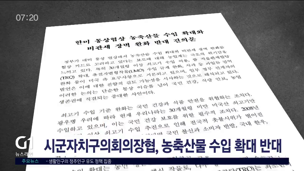 대한민국 시군자치구의회 의장협의회가 한미통상협상 관련 농축산물 수입 확대와 비관세 장벽 완화에 대해 반대 입장을 분명히 했습니다.