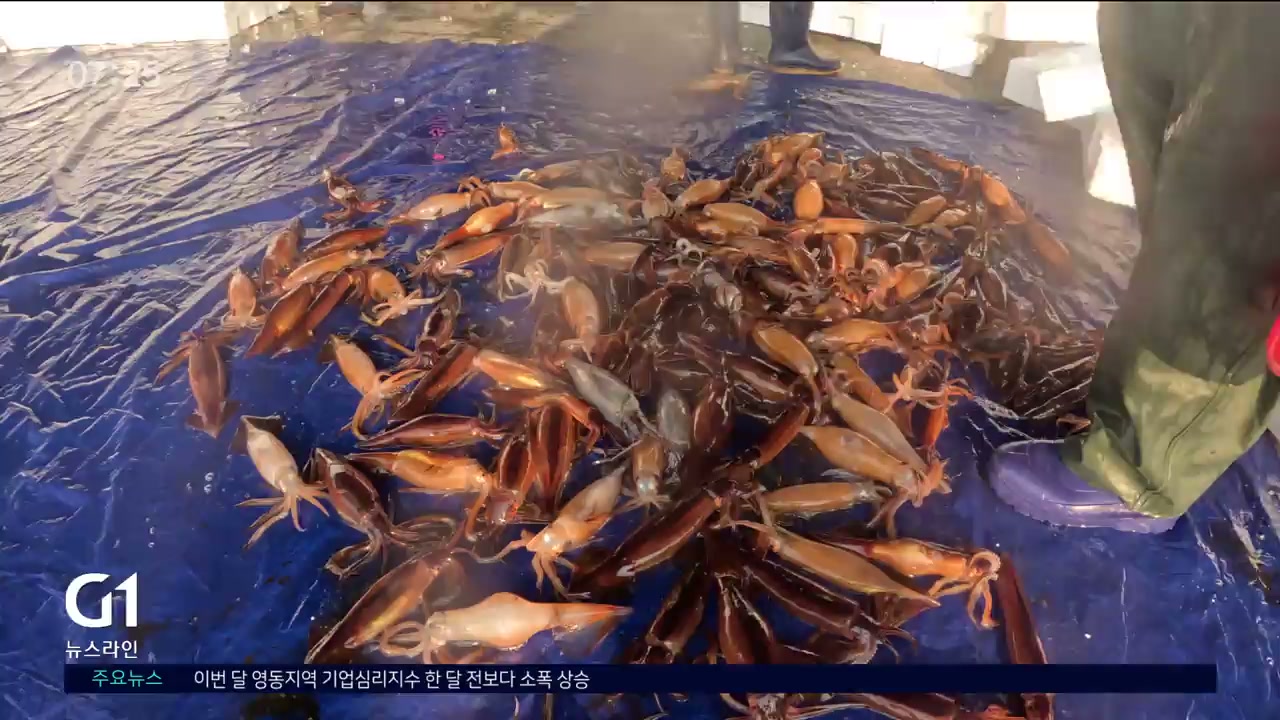 강원자치도 글로벌본부에 따르면, 지난 16일부터 22일까지 도내 오징어 어획량은 29t으로 전주 127톤의 23% 수준에 머물렀습니다.