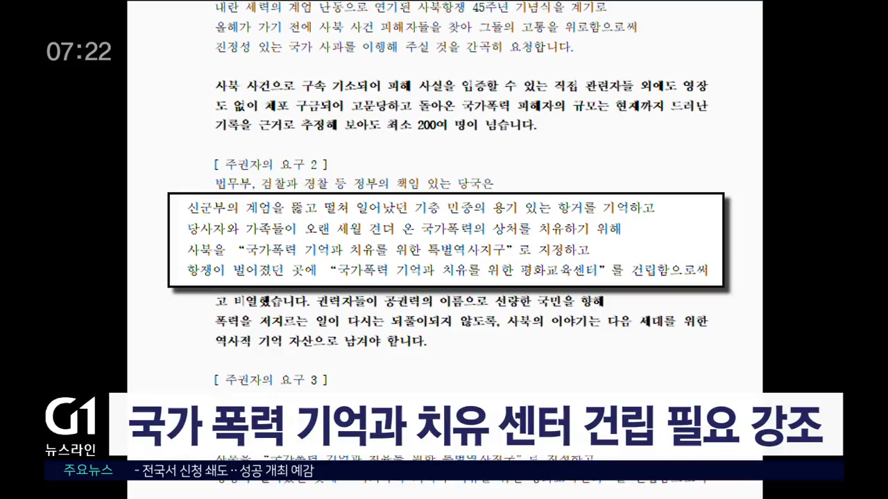 요구서에는 사북항쟁 45주년을 맞아 국정 최고 책임자의 진정성 있는 국가 사과를 이행하고, 직권 조사를 통한 피해자들의 명예 회복, 국가폭력 기억과 치유를 위한 평화 교육 센터 건립 등이 담겼습니다.