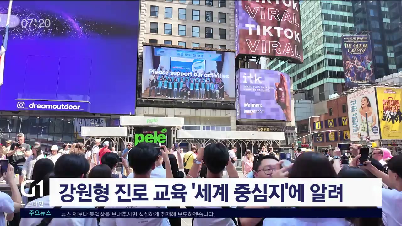 "저는 지금 뉴욕 타임스퀘어 앞에 나와 있습니다. 잠시 뒤 바로 이곳에 강원 지역 학생들의 진로 체험 활동 영상이 송출됩니다."