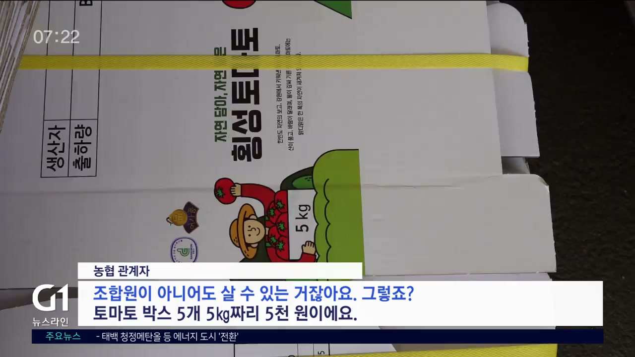 "(조합원이 아니어도 살 수 있는 거잖아요. 그렇죠?) 토마토 박스 5개 5kg 짜리 5천 원이에요."