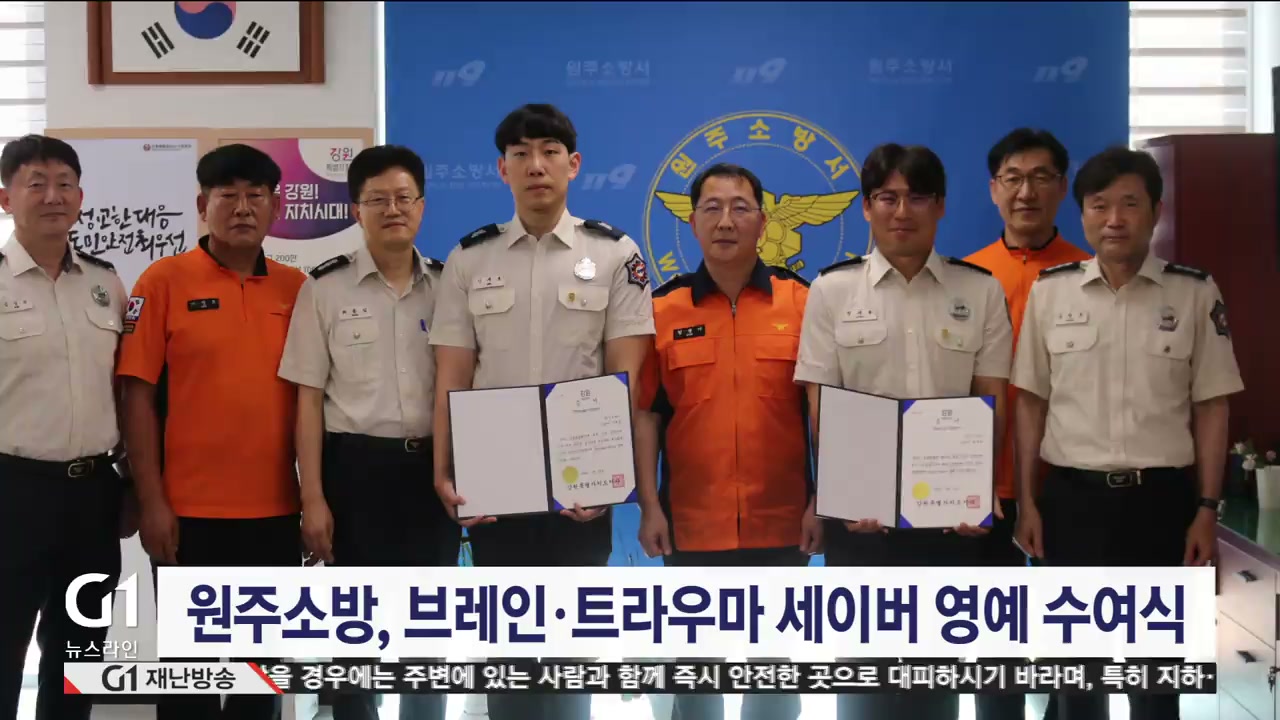 원주소방서가 어제(25일) 신속한 응급처치로 시민의 생명을 구하는데 기여한 구급대원에게 브레인·트라우마 세이버 증서를 수여했습니다.