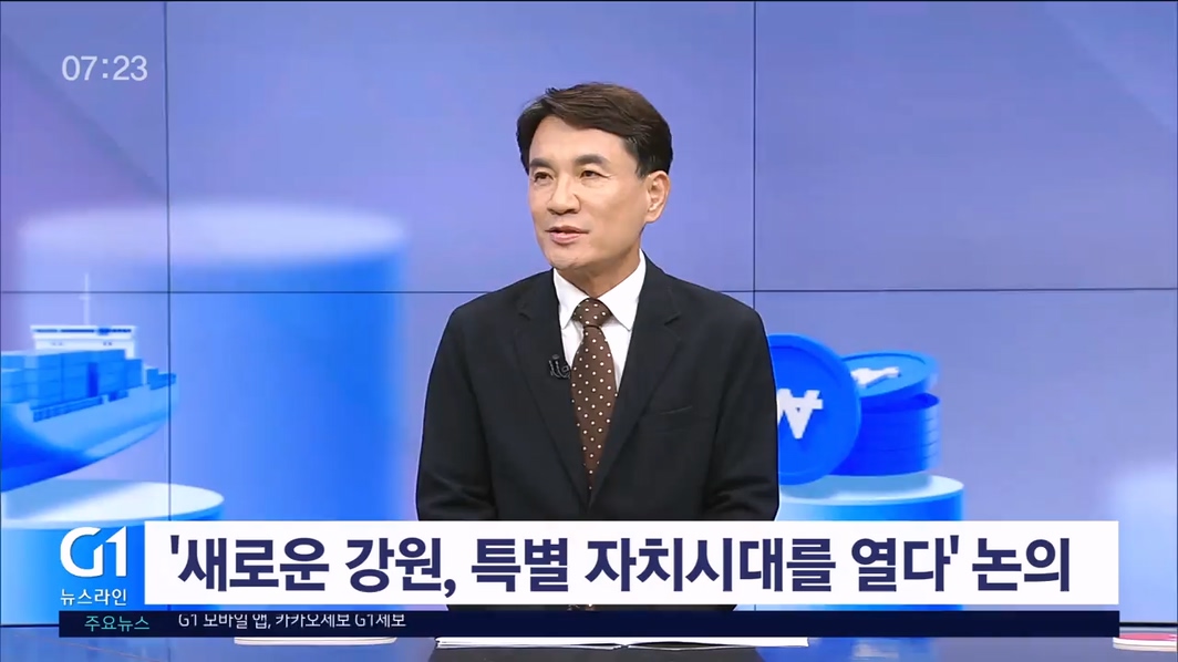 G1방송과 강원도민일보, 강원일보가 공동 주관하는 토론회에는 김진태 강원자치도지사와 김재진 강원연구원 기획조정실장이 전문가 패널로 출연해 '새로운 강원, 특별 자치시대를 열다'를 주제로 다뤘습니다.
