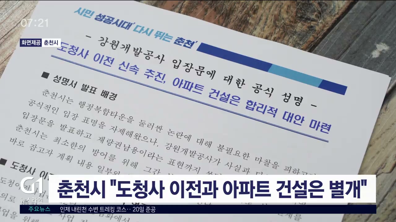 춘천시는 "도청사 이전을 위해 시는 도시관리계획 결정, 보상협의회 구성, 실시계획인가 등 전폭적인 지원과 협조를 진행 중"이라고 강조했습니다.
