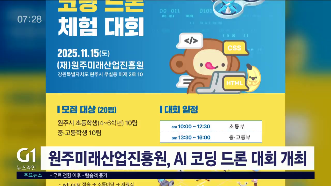 원주미래산업진흥원이 관내 초중고등학생을 대상으로 다음달 15일 'AI 코딩 드론 체험형 대회'를 개최합니다.