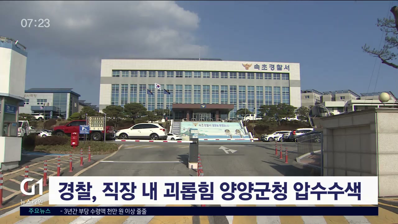 속초경찰서는 어제(27일) 양양군청 직장 내 괴롭힘 의혹과 관련해 군청과 피의자 주거지, 면사무소 등 3곳을 압수수색했다고 밝혔습니다.