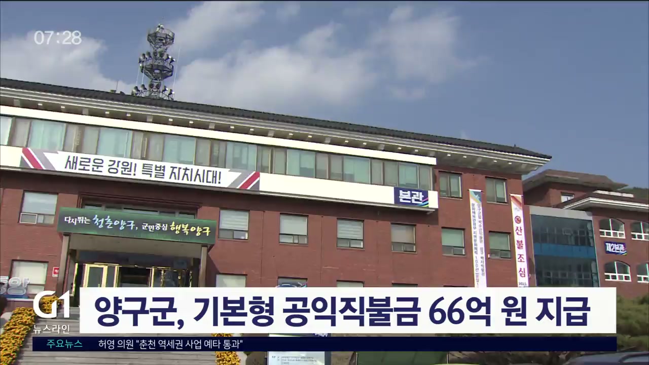 양구군이 지역 농가 2,700여 곳에 기본형 공익직불금 66억여 원을 지급합니다.