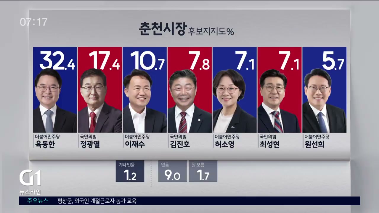 이어 정광열 전 삼성전자 부사장 17.4%, 이재수 전 춘천시장 10.7%, 김진호 춘천시의장 7.8%, 허소영 민주당 중앙당 부대변인과 최성현 강원관광재단 대표가 각각 7.1%, 원선희 민주당 정책위원회 부의장 5.7% 순입니다.