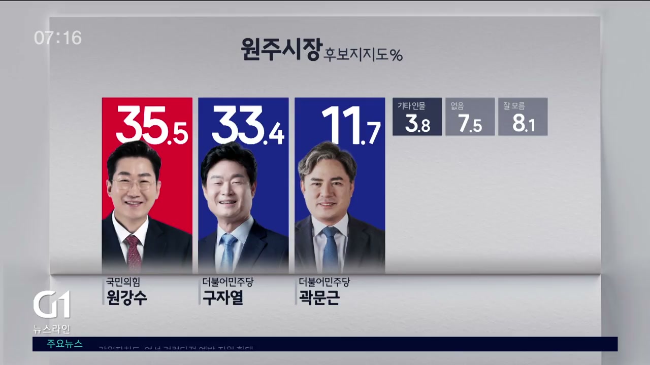 현직인 원강수 시장과 여당 후보들이 오차범위 내 접전인 걸로 나타났습니다.