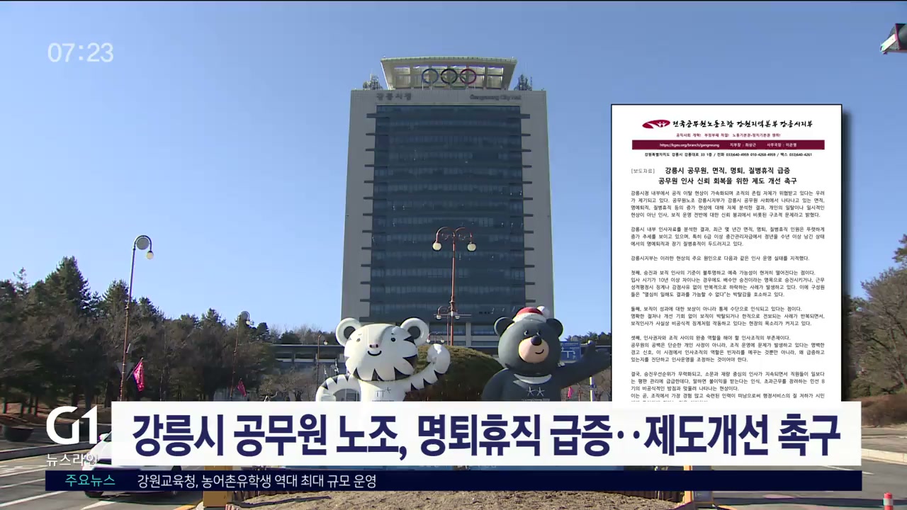 이에대해 강릉시는 "면직과 질병휴직 등은 전국 지자체가 공통적으로 직면한 문제이고, 노조에서 요구하는 다면평가는 점차 폐지되는 추세라며, 다양한 의견을 청취하고 수렴해 예측가능한 인사를 실시하고 있다"고 밝혔습니다.