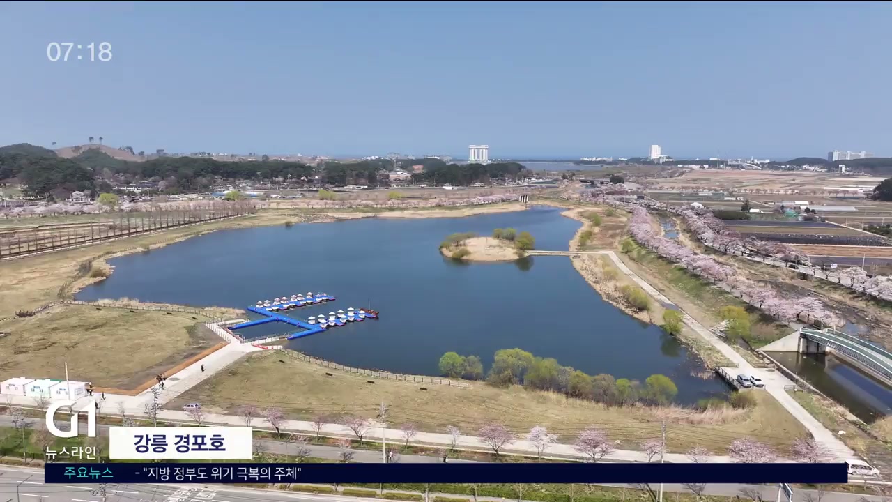 강릉 대표 호수인 경포호 일대와 주변 도로에 벚꽃이 피기 시작했습니다.