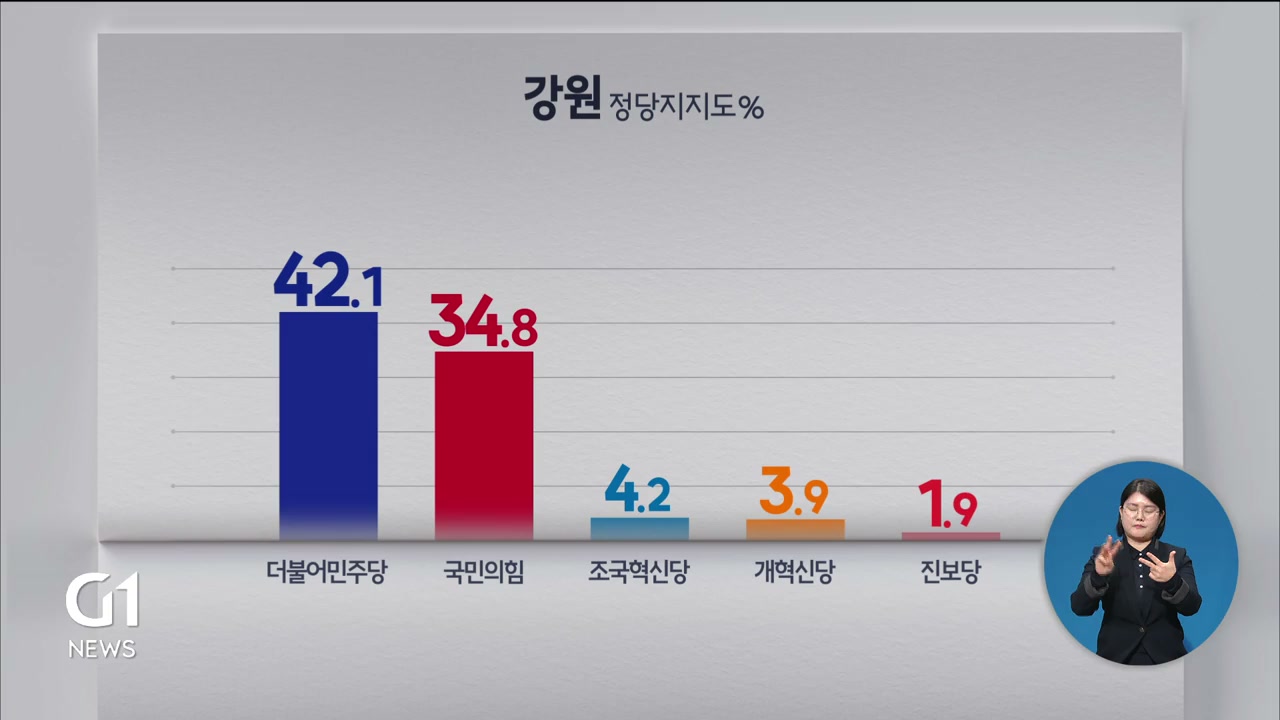 동해-태백-삼척-정선과 홍천-횡성-영월-평창 두 권역만 양대 정당의 지지도가 오차 범위 안이었고,