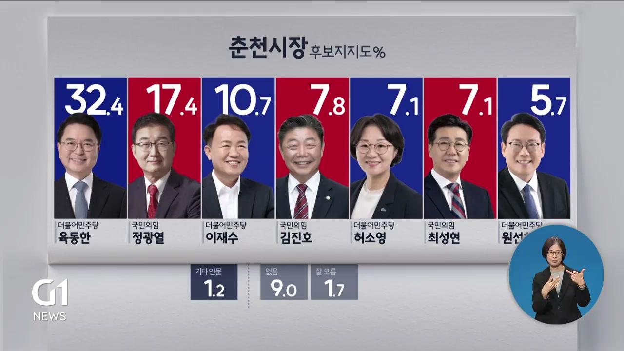 이어 정광열 전 삼성전자 부사장 17.4%, 이재수 전 춘천시장 10.7%, 김진호 춘천시의장 7.8%, 허소영 민주당 중앙당 부대변인과 최성현 강원관광재단 대표가 각각 7.1%, 원선희 민주당 정책위원회 부의장 5.7% 순입니다.