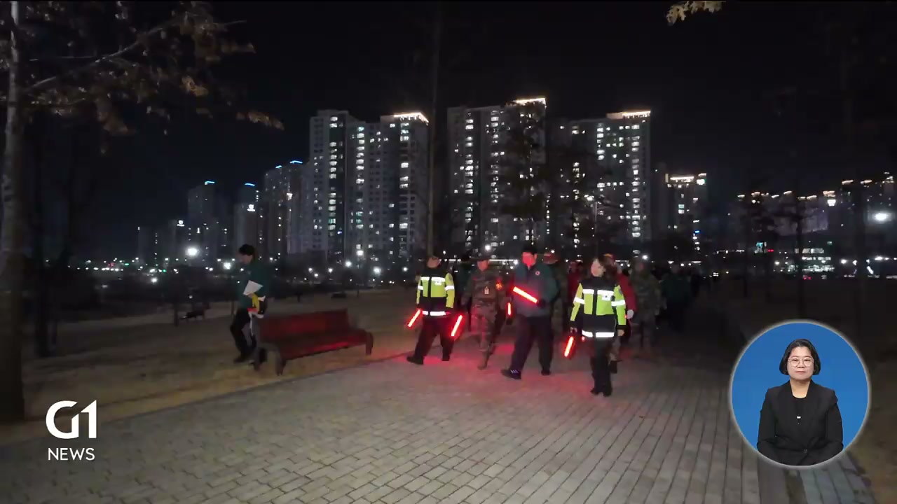 다양한 복장의 사람들이 경광봉과 손전등을 들고 도심 곳곳을 살핍니다.