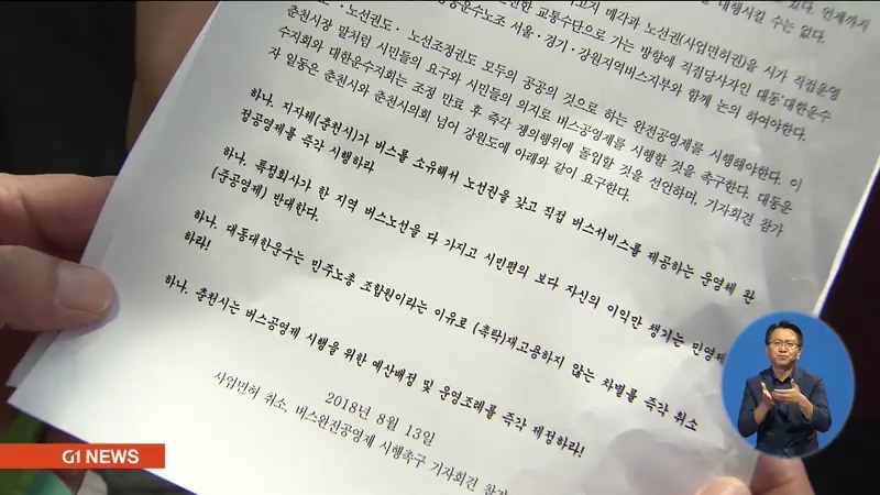 노조는 사측이 춘천시에 보조금 인상과 차고지 매입 등을 요청한 것은 미봉책에 불과하고, 시가 지원하는 손실보조금 없이는 시내버스 운영이 사실상 불가능한 상황이기때문에 문제 해결을 위해선 완전 공영제를 즉각 시행해야 한다고 주장했습니다.