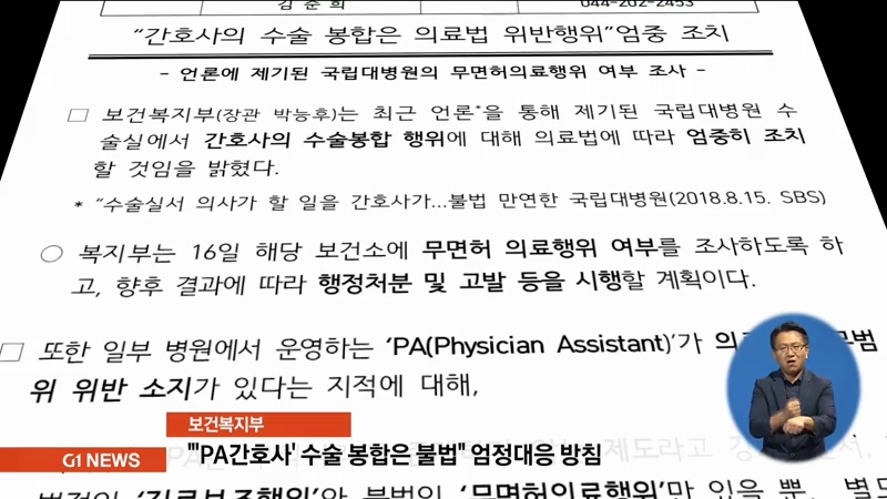 수술 봉합 등 의사가 해야할 업무를 이른바 'PA간호사'가 해 물의가 일고 있다는 G1 보도에 대해 보건복지부가 고발 등 엄정대응하겠다는 입장을 내놨습니다.