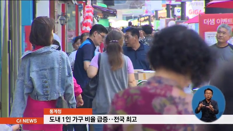 통계청이 발표한 '2017 인구주택 총조사'에 따르면, 도내 1인 가구는 19만 9천654가구로, 전체 가구의 32.2%에 달했고, 전국 17개 시.도 가운데 가장 높았습니다.