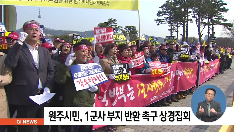 1군사령부 이전부지 환원 원주 범시민 대책위원회는 어제(19일) 서울 국방부 앞에서 집회를 열고, 1군사령부 부지의 즉각 환원을 촉구했습니다.