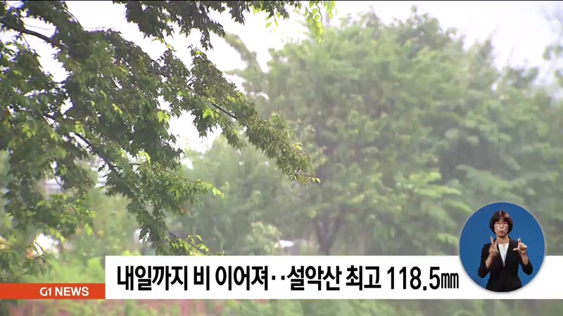 어젯밤부터 오늘 오전까지 내린 비의 양은 설악산이 118.5mm로 가장 많았고, 미시령 115mm, 향로봉 105.5mm를 기록하고 있습니다.
