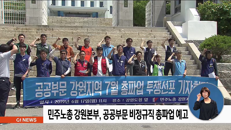 민주노총 공공부문 비정규직 철폐 강원지역 공동 파업위원회는 어제(17일) 강원도청 앞에서 기자회견을 열고, 비정규직 철폐와 최저임금 인상과 관련, 다음 달 4일부터 이틀간 총파업에 나선다고 밝혔습니다.