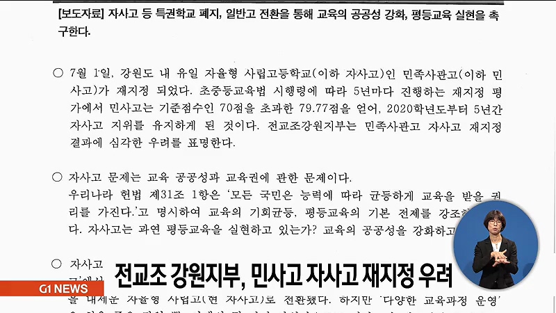 도내 유일의 자율형 사립고인 횡성 민족사관고가 도교육청 지정운영위원회의 평가를 통해 재지정된 것과 관련해 전교조가 심각한 우려를 표명했습니다.