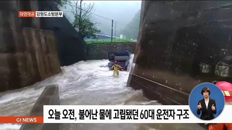 오늘 오전 6시30분쯤 삼척시 미로면 하정리의 한 도로에서 불어난 물에 고립됐던 60대 운전자가 긴급 구조됐습니다.