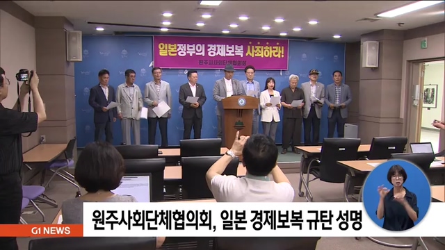 원주시 사회단체협의회는 어제(29일), 원주시청 브리핑룸에서 일본 정부의 경제보복 조치를 규탄하는 성명서를 발표했습니다.