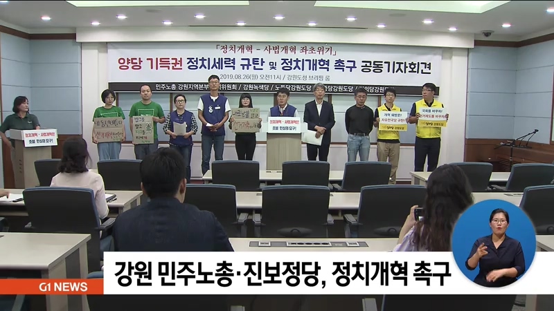 민주노총 강원지역본부 정치위원회와 강원녹색당, 노동당 강원도당 등 도내 4개 진보단체와 정당은 강원도청에서 공동 기자회견을 열어 개혁을 촉구하고 기득권 정치세력을 규탄했습니다.