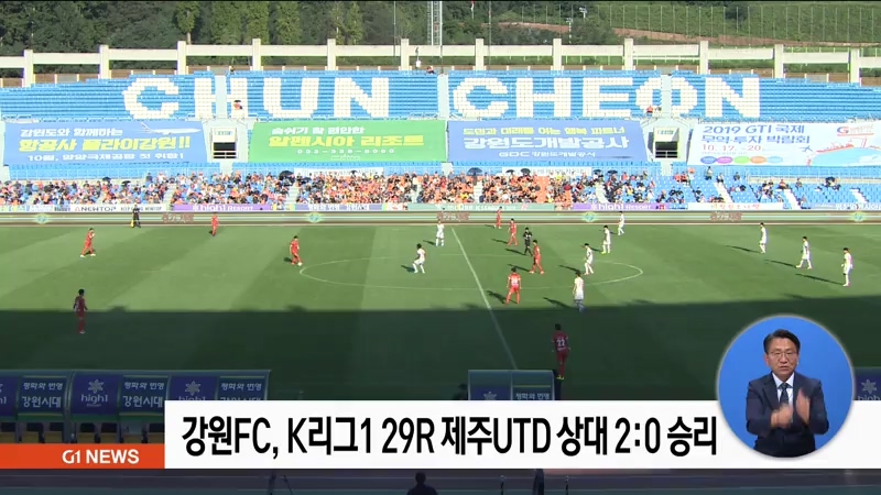 강원FC는 오늘 오후 춘천 송암스포츠타운 주경기장에서 열린 '하나원큐 K리그1 2019' 29라운드 홈경기에서 전반 19분과 36분에 터진 김지현의 연속골에 힘입어 제주유나이티드를 2:0으로 꺾고 승점 3점을 확보했습니다.