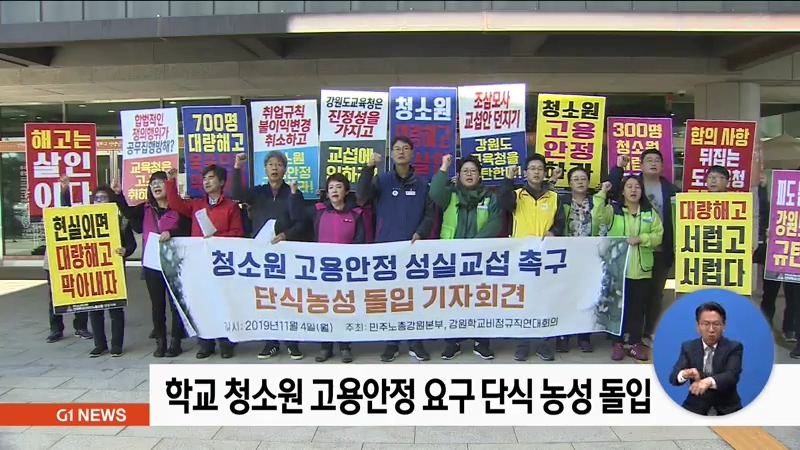 학교비정규직연대회의는 기자회견을 통해 "정부와 강원도교육청이 취업규칙에 사전심사제를 신설해 295명의 청소원이 실직하게 됐다"고 주장했습니다.