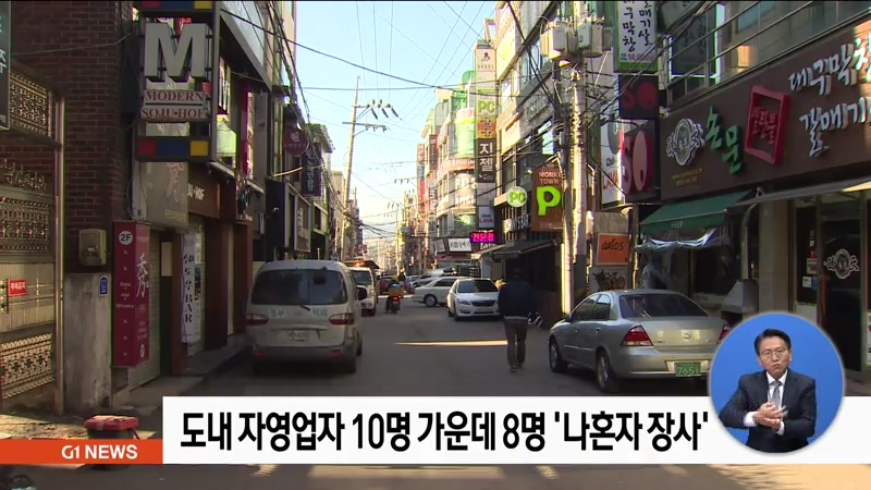 통계청에 따르면, 지난 8월 기준으로 도내 고용원이 없는 자영업자 수는 17만 3천명으로 지난해보다 만명이 늘어, 전체 자영업자 가운데 80% 정도가 직원을 고용하지 않고 운영하고 있습니다.