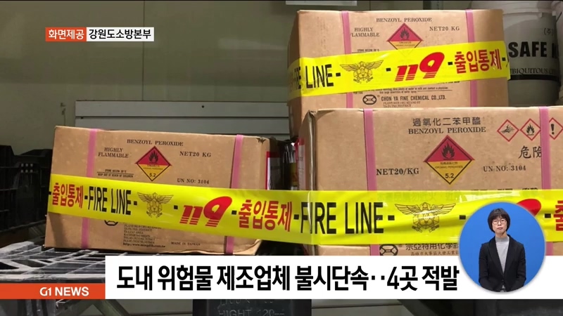 강원도소방본부는 화재와 위험물 사고를 예방하기 위해 도내 위험물 제조업체 11곳을 불시단속한 결과, 4곳이 적발됐다고 밝혔습니다.