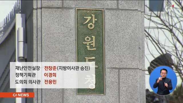 이번 인사로 전창준 재난안전실장이 지방이사관으로 승진 임용됐고, 정책기획관에 이경희 평화지역문화관장, 도의회 의사관에 전용민 레고랜드지원과장을 승진 임용했습니다.