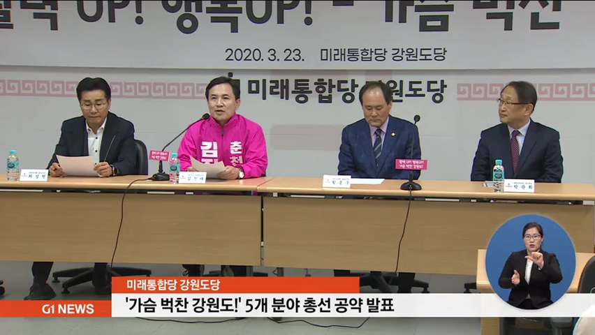 미래통합당 강원도당도 김진태 강원도 선대위원장을 비롯한 당직자들이 참석한 가운데 '활력 업, 행복 업 - 가슴 벅찬 강원도'를 테마로 한 5개 분야별 공약을 제시하고, 앞으로 다섯차례에 걸쳐 부분별 세부 실천 공약 발표를 예고했습니다.