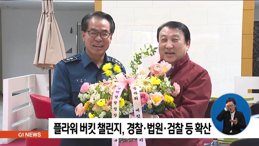 김재규 강원지방경찰청장은 어제(25일) G1 강원민방을 방문해 조창진 대표이사 회장에게 꽃다발을 전달하며 플라워 버킷 챌린지 동참을 요청했습니다.