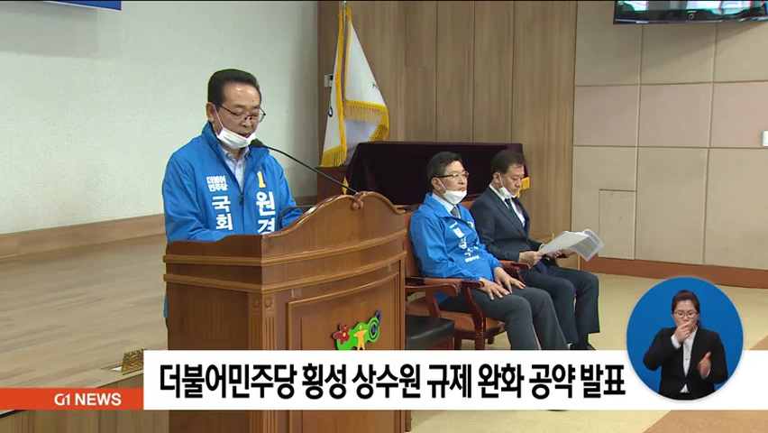 더불어민주당 이광재 강원권역선대위원장과 원경환 홍천·횡성·평창·영월 예비후보, 장신상 횡성군수 예비후보는 어제(25일) 횡성군청에서 합동 기자회견을 열고 상수원 규제 완화를 위한 공약을 발표했습니다.