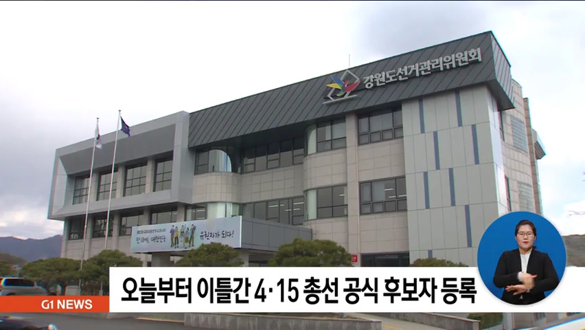 강원도선거관리위원회는 오늘부터 이틀간 오전 9시부터 오후 6시까지 관할 선거구 선거관리위원회에서 4·15 총선 후보자 등록 신청을 받는다고 밝혔습니다.