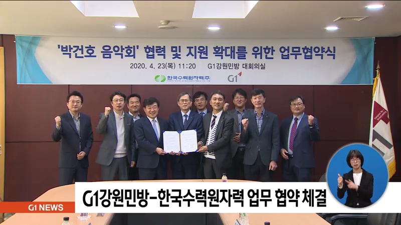 G1강원민방과 한국수력원자력 주식회사는 어제(23일) G1본사 대회의실에서 허인구 G1사장과 정재훈 한수원 사장, 정헌철 한강수력본부장 등이 참석한 가운데 '박건호 음악회' 성공 개최를 위한 업무 협약을 맺었습니다.
