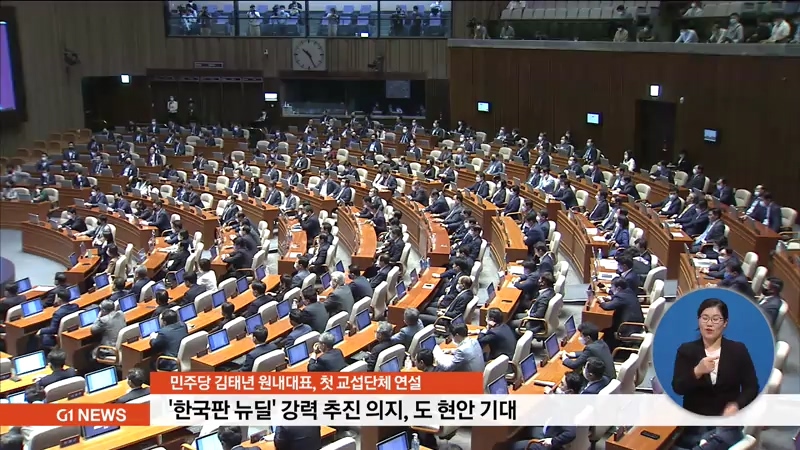 더불어민주당 김태년 원내대표가 취임 후 첫 교섭단체 대표 연설에서 '한국판 뉴딜' 정책 추진 의지를 재확인해, 강원도 현안 사업 추진에 대한 기대감이 높아지고 있습니다.