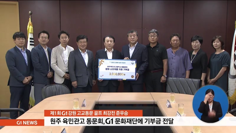 최근 성황리에 폐막한 '제1회 G1 강원 고교동문 골프 최강전'에서 준우승을 차지한 원주 육민관 고등학교 동문회가 대회 주최측인 G1 강원민방에 도내 문화 소외 계층을 위한 기부금을 전달했습니다.