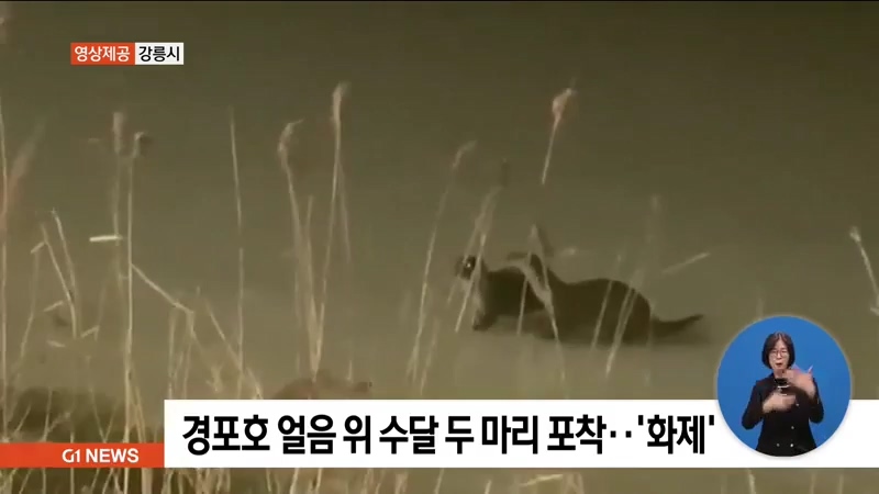 꽁꽁 언 강릉 경포호 위에서 뛰어 놀고 있는 수달 두마리의 모습이 포착돼 화젭니다.