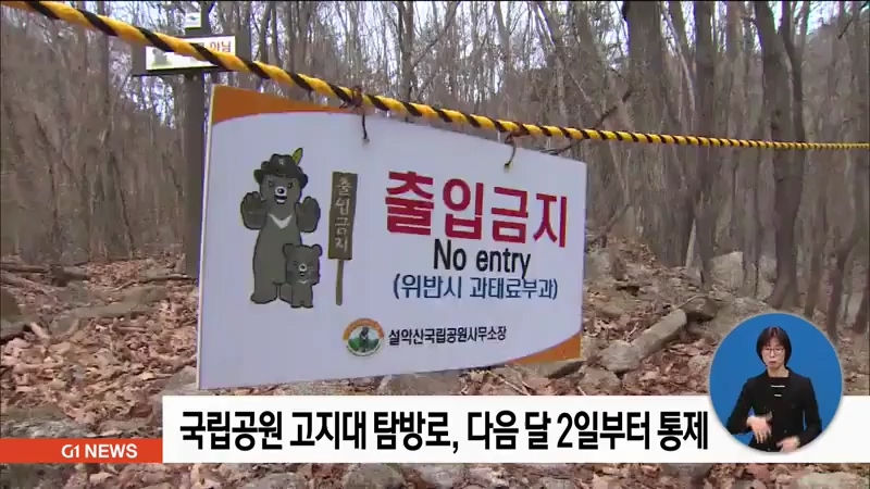설악산과 치악산, 오대산, 태백산 등 도내 4곳의 국립공원 고지대 탐방로 출입이 다음달 2일부터 통제됩니다.