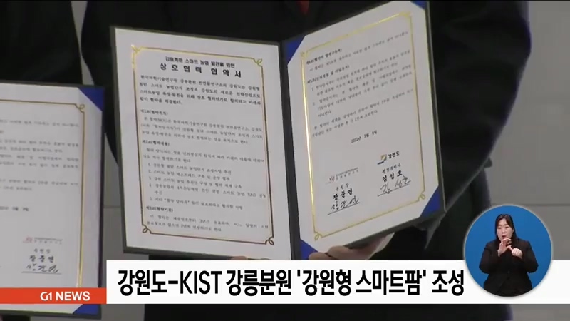 강원도와 한국과학기술연구원 강릉분원 천연물연구소는 '강원특화 스마트 농업 발전을 위한 상호협력 업무협약'을 체결했습니다.