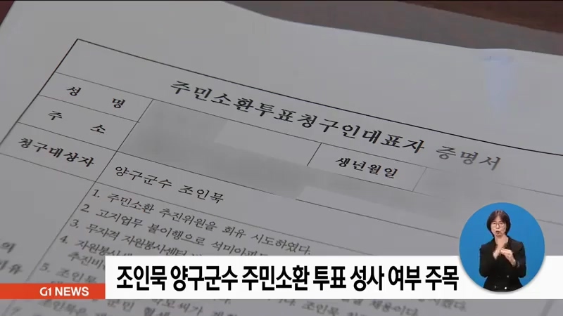 양구의 한 청년단체가 조인묵 양구군수에 대한 주민소환을 추진하고 있는 가운데, 투표 성사 여부가 주목됩니다.