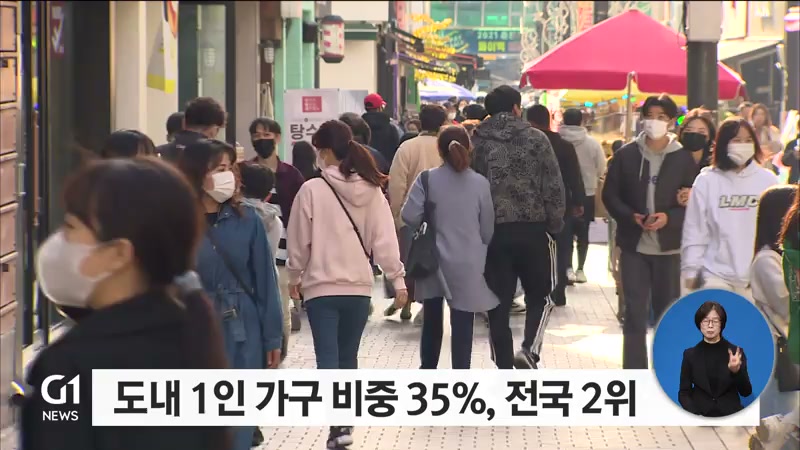 통계청이 발표한 '2021 통계로 보는 1인 가구' 결과에 따르면, 지난해 도내 1인 가구는 전체 66만 1,000가구 가운데 35.5%인 23만 1,000가구로 집계됐습니다.