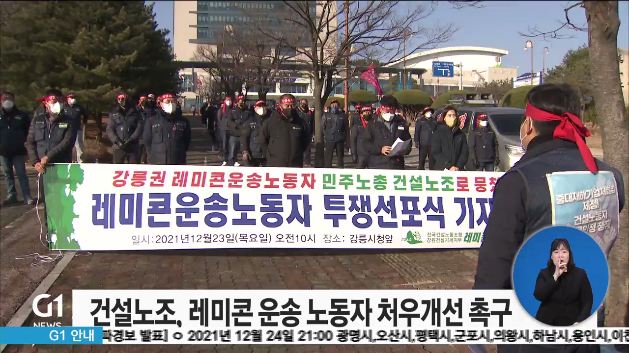 전국건설노동조합 강원건설기계지부가 강릉시청 앞에서 기자회견을 열고 영동지역 레미콘 운송 노동자의 처우개선과 운송 단가 인상을 촉구했습니다.